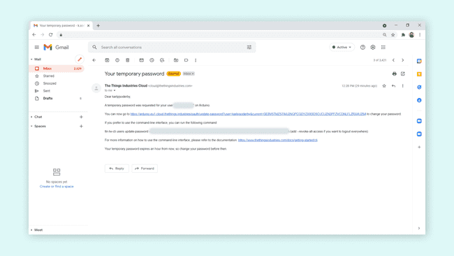 1. After your device is successfully configured, an email is sent to your account's email address, and an account is automatically created on The Things Stack Network. The email includes a link to creating a password for that account, which you will need to follow to complete the registration.